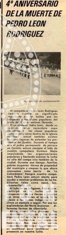 La nota da cuenta de la manifestación celebrada en homenaje al compañero Pedro León Rodríguez, sacerdote de la comunidad, quien junto al compañero Gustavo Mejía, desempeñó un importante papel de liderazgo y acompañamiento mientras fue párroco de Corinto. Ya sea apoyando a las familias que crearon el barrio La Colombiana o simplemente ampliando el apoyo dentro de la iglesia católica a las luchas indígenas, la presencia de Pedro León será homenajeada en la asamblea llevada a cabo en su nombre.