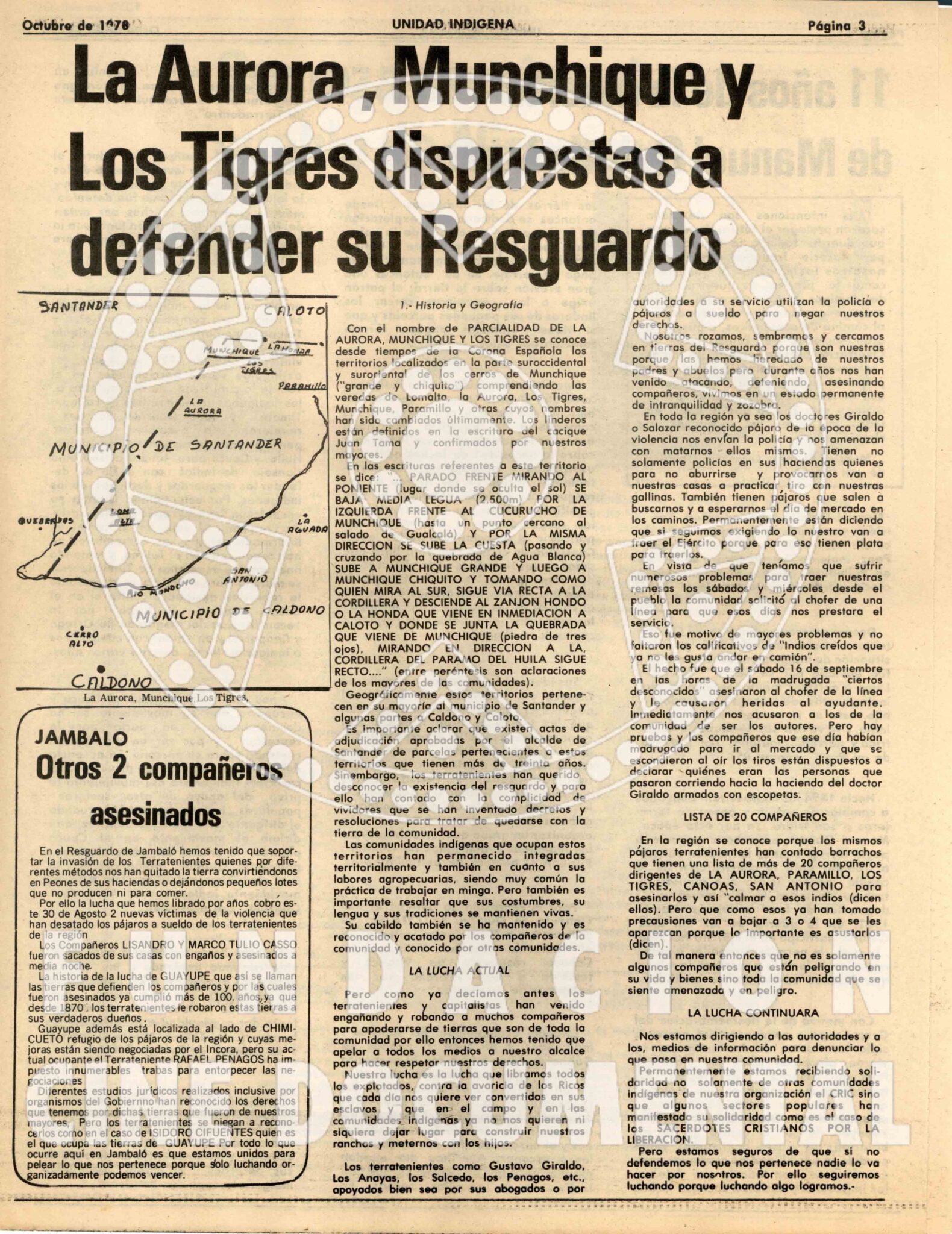 En el artículo se denuncia el hostigamiento y las amenazas que los terratenientes y capitalistas vienen realizando contra las comunidades indígenas que habitan el resguardo ubicado entre La Aurora, Munchique y Los Tigres. Dividido en cuatro secciones (Historia y Geografía, La lucha actual, Lista de 20 compañeros y La lucha continuará) empieza citando los límites del resguardo desde una escritura de la Corona Española y señalando las artimañas legales para desconocer dicha escritura.