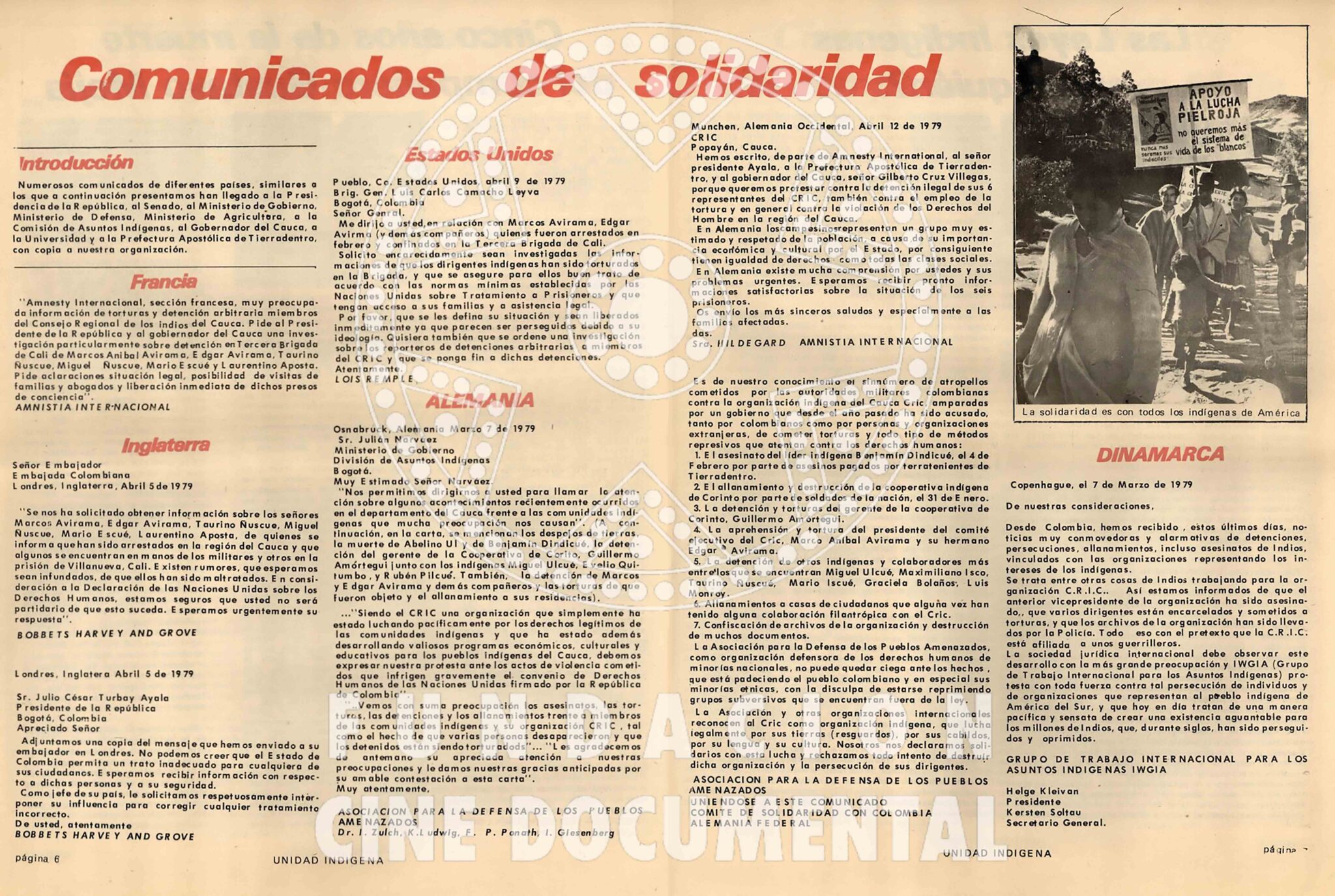 Artículo doble página que reproduce los distintos comunicados de solidaridad con los dirigentes del CRIC apresados, que han sido enviados desde varias organizaciones de diferentes países, con destino a la Presidencia de la República, el Senado, Min Gobierno, Min Defensa, Min Agricultura, Comisión de Asuntos Indígenas, Gobernación del Cauca, Universidad del Cauca y la Prefectura Apostólica de Tierradentro.