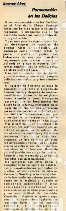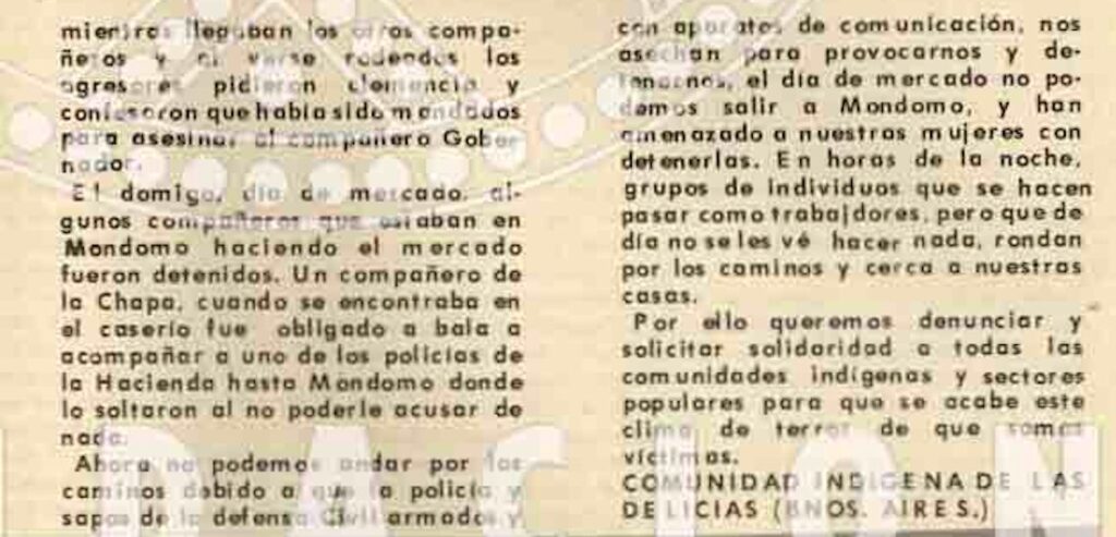 La nota da cuenta de los atropellos que ha estado viviendo la comunidad de Las Delicias, desde detenciones arbitrarias, omisión interesada de las autoridades competentes, afectación su movilidad y recorridos cotidianos, hasta robos de cosecha e intento de asesinato del gobernador indígena. Finaliza denunciando estos hechos y llamando a la solidaridad a todas la comunidades indígenas para ayudar a que se acabe dicho clima de terror.
