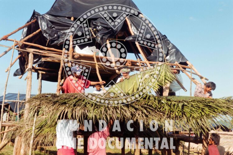 DESCRIPCIÓN: Grupo de siete hombres participando de la construcción del techo.