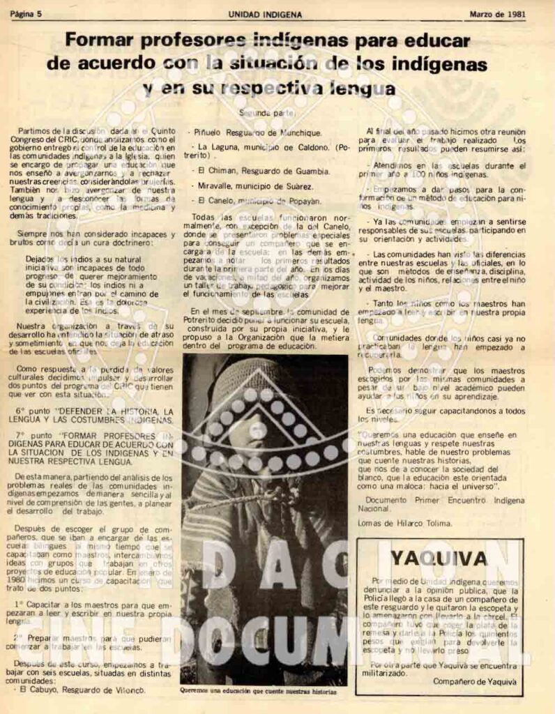 TEMÁTICOS: V Congreso del CRIC, El Cabuyo Resguardo Vitoncó, Piñuelo Resguardo de Munchique, La Laguna municipio de Caldono, El Chiman resguardo de Guambía, Maravalle municipio de Súarez, El Canelo municipio de Popayán, Taller de trabajo pedagógico, método de educación para niños indigenas, maestros escogidos por la comunidad