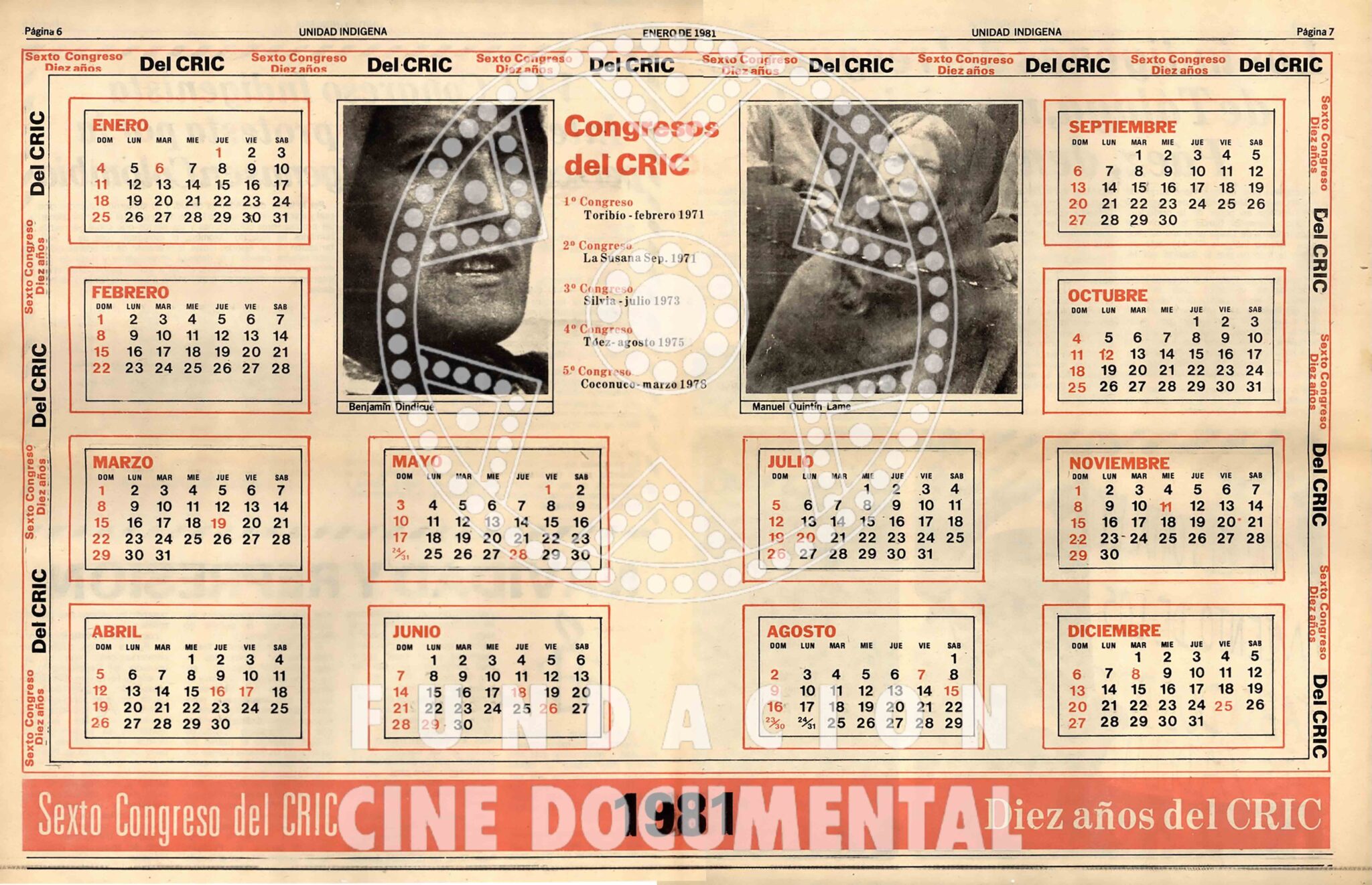 Calendario doble página sobre el sexto congreso y los 10 años del CRIC.