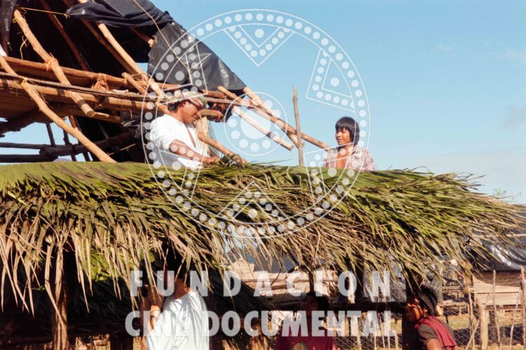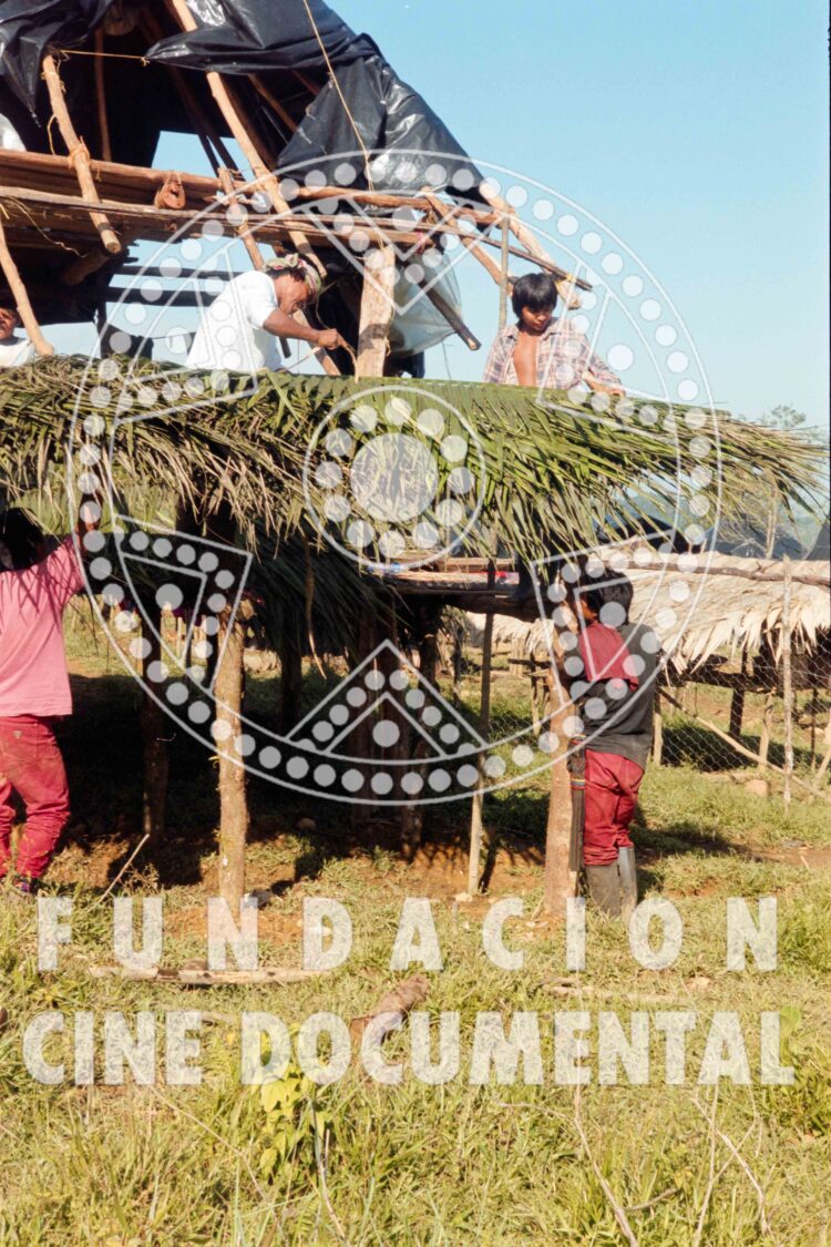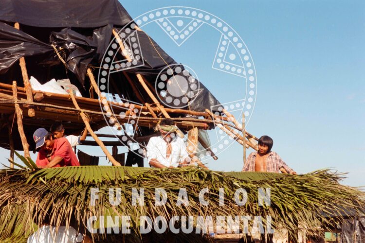 CÓDIGO: F0284 AUTOR: Marta Rodríguez DESCRIPCIÓN: Fotografía de una niña embera con un niño en brazos de espaldas, observando hacia un toldo de techo de plástico negro. PERSONA JURÍDICA/NATURAL/ROL: TOPONÍMICOS: Cacarica – Chocó TEMÁTICOS: Indígenas. Emberas. Desplazamiento. Resistencia. Cacarica. CRONOLÓGICOS: 1997 – 1999 SOPORTE: TRIACETATO FORMATO: 35mm CROMÍA: Negativo Color