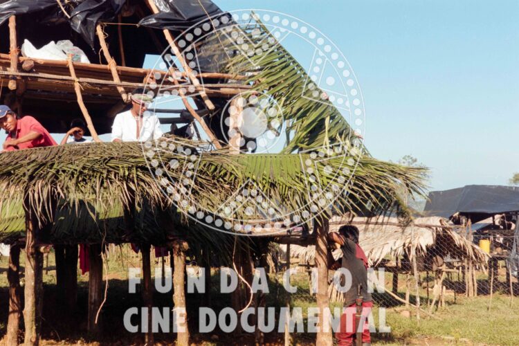 CÓDIGO: F0274 AUTOR: Marta Rodríguez DESCRIPCIÓN: Fotografia de un grupo de hombres emberas construyendo un techo con hojas de palma. En la imagen puede verse la estructura en madera, dos hombres subidos en lo que es el techo y un hombre apoyado en uno de los parales de la construcción. El hombre tiene un machete […]